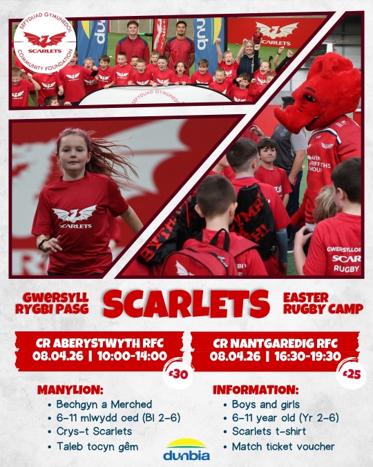 Fe fydd y gwersyll cyntaf yn Arena FSG Parc y Scarlets (Ebrill 1) ac yna fe fydd y tîm cymunedol yn crwydro’r rhanbarth gan gynnal gwersyll yng nghlwb rygbi Aberystwyth a chlwb rygbi Nantgaredig ar yr 8 Mawrth.