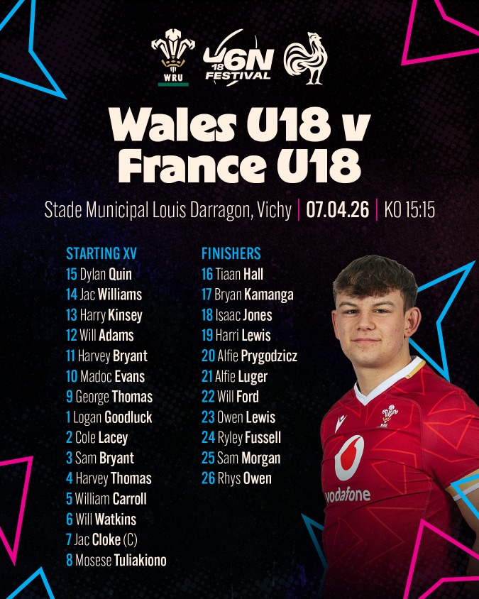 FINISHERS – 16 Tiaan Hall (Coleg Gwent, Dragons RFC), 17 Bryan Kamanga (Llandovery College, Cardiff Rugby), 18 Isaac Jones (Ysgol Glantaf, Cardiff Rugby), 19 Harri Lewis (Llandovery College, Cardiff Rugby), 20 Alfie Prygodzicz (Ysgol Glantfaf, Cardiff Rugby), 21 Alfie Luger (Llandovery College, Scarlets), 22 Will Ford (St Cenydd, Dragons RFC), 23 Owen Lewis (Coleg y Cymoedd, Cardiff Rugby), 24 Ryley Fussell (Coleg y Cymoedd, Dragons), 25 Sam Morgan (St Cenydd, Coleg Gwent, Dragons RFC), 26 Rhys Owen (Coleg Sir Gar, Scarlets)