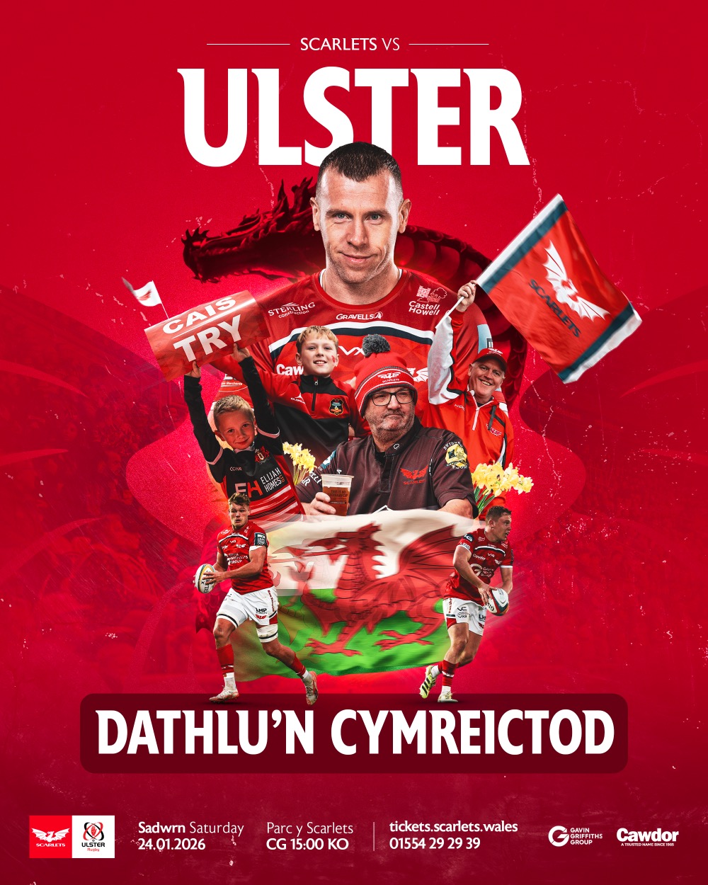 Mae tocynnau Scarlets v Ulster, Sadwrn 24ain Ionawr cic gyntaf 15:00, ar werth nawr.