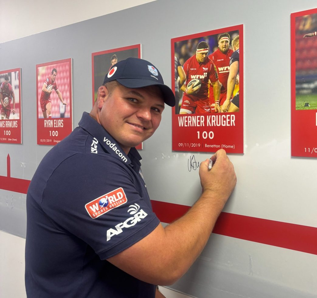 After Saturday’s thriller, Werner signed his 100th appearance ‘Milestone Photo’ which sits proudly on the walls of the tunnel at Parc y Scarlets.